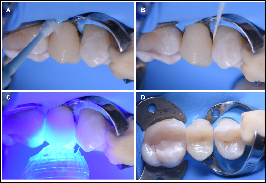 Figura 4: A. Inserção do conjunto coroa-cimento e remoção dos excessos de cimento com Points; (B). remoção do excesso nas superfícies proximais utilizando fio dental; (C) Após tempo de espera de 5 min, para reação química do material, foi realizada fotoativação do cimento utilizando o fotopolimerizador Radii Xpert (SDI). D Coroa imediatamente após a cimentação.