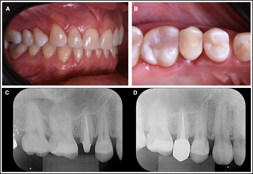 Figura 5. (A) Aspecto final da coroa após os ajustes oclusais e o polimento final; (B) Vista oclusal da coroa finalizada; (C) Rx inicial do paciente com a coroa provisória; (D). Rx final da coroa cerâmica zircônia cimentada com cimento autoadesivo automix Set Maxx (SDI).