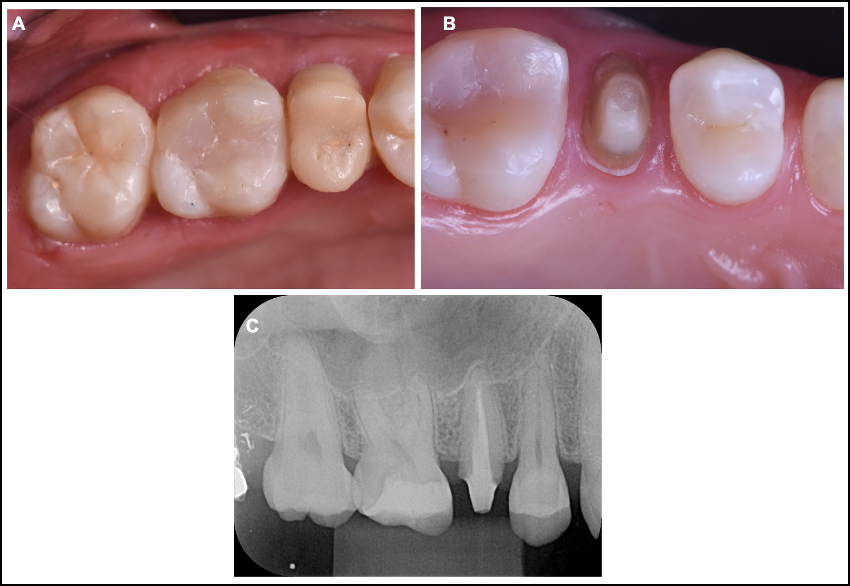 Figura 1. Vista oclusal e vestibular do segundo pré-molar direito com restauração provisória com resina acrílica; B. preparo coronário insatisfatório, com quantidade de desgaste insuficiente na superfície oclusal, direção de inserção da coroa alterada e término cervical irregular; C. Rx mostrando pino de fibra de vidro e tratamento endodôntico satisfatório.