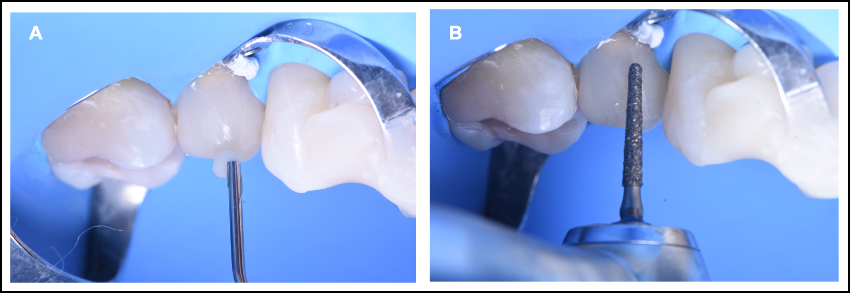 Figura 2. Uso de resina flow para viabilizar acréscimo de estrutura para difinição do preparo cavitário; B. re-preparo realizado com ponta diamantada com término arredondado e conicidade requerida.