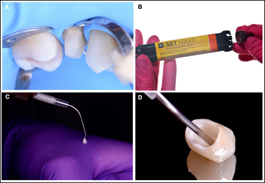 Figura 3. (A) Preparo limpo com pedra pomes demostrando espessura, inclinações e desgastes adequados; (B) Seleção do cimento autoadesivo Set Maxx Automix acoplando ponta misturadora; (C) descarte da porção inicial do cimento resinoso após a mistura; (D) Inserção do cimento resinoso Dual Set Maxx (SDI) no interior da coroa de zircônia, utilizando a ponta aplicadora colibri.