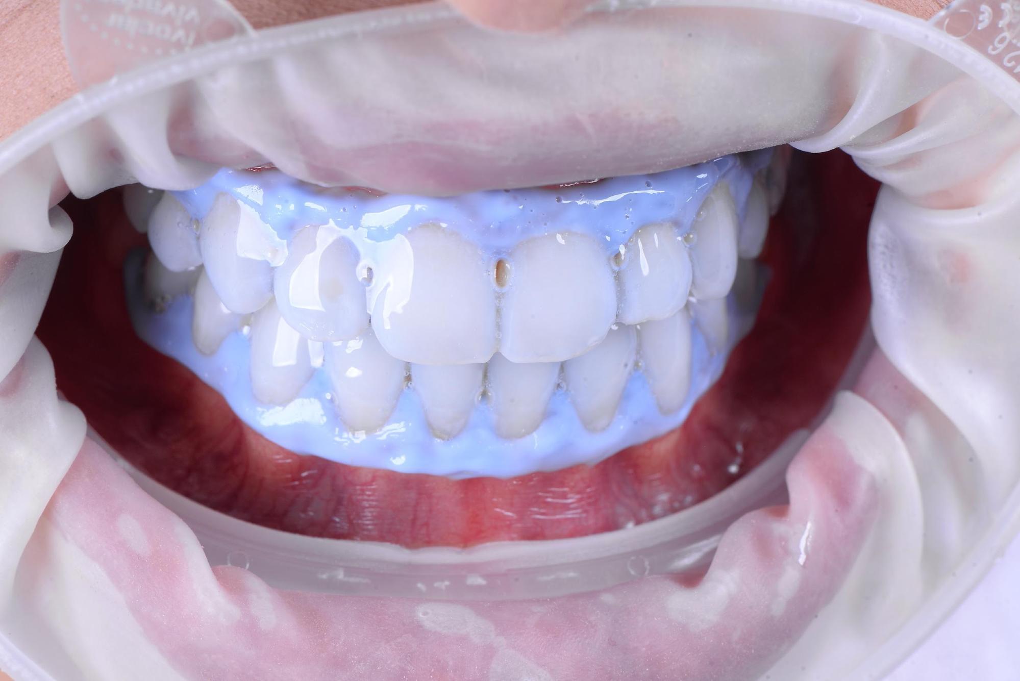Paciente do gênero feminino, 25 anos, aluna da especialização de Dentística e Prótese, procurou os professores e coordenadores para que pudesse clarear os seus dentes, pois relatava insatisfação com a cor dos dentes, sem apresentar sinais de sensibilidade ou alterações clínicas associadas.