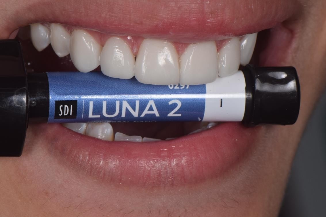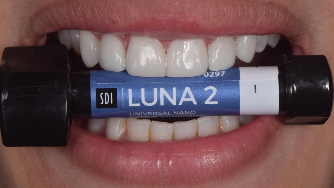 Optamos pela resina Luna 2 (SDI) por ter ótimas propriedades mecânicas, estética avançada, fácil manuseio, excelente esculpibilidade, com alto grau de opacidade para fazer o bloqueio de fundos escuros assim como um brilho diferenciado após um bom polimento, conferindo naturalidade ao sorriso. Por esse motivo a utilizamos em nosso dia a dia clínico e indicamos em nossos cursos. Não foi realizado nenhum