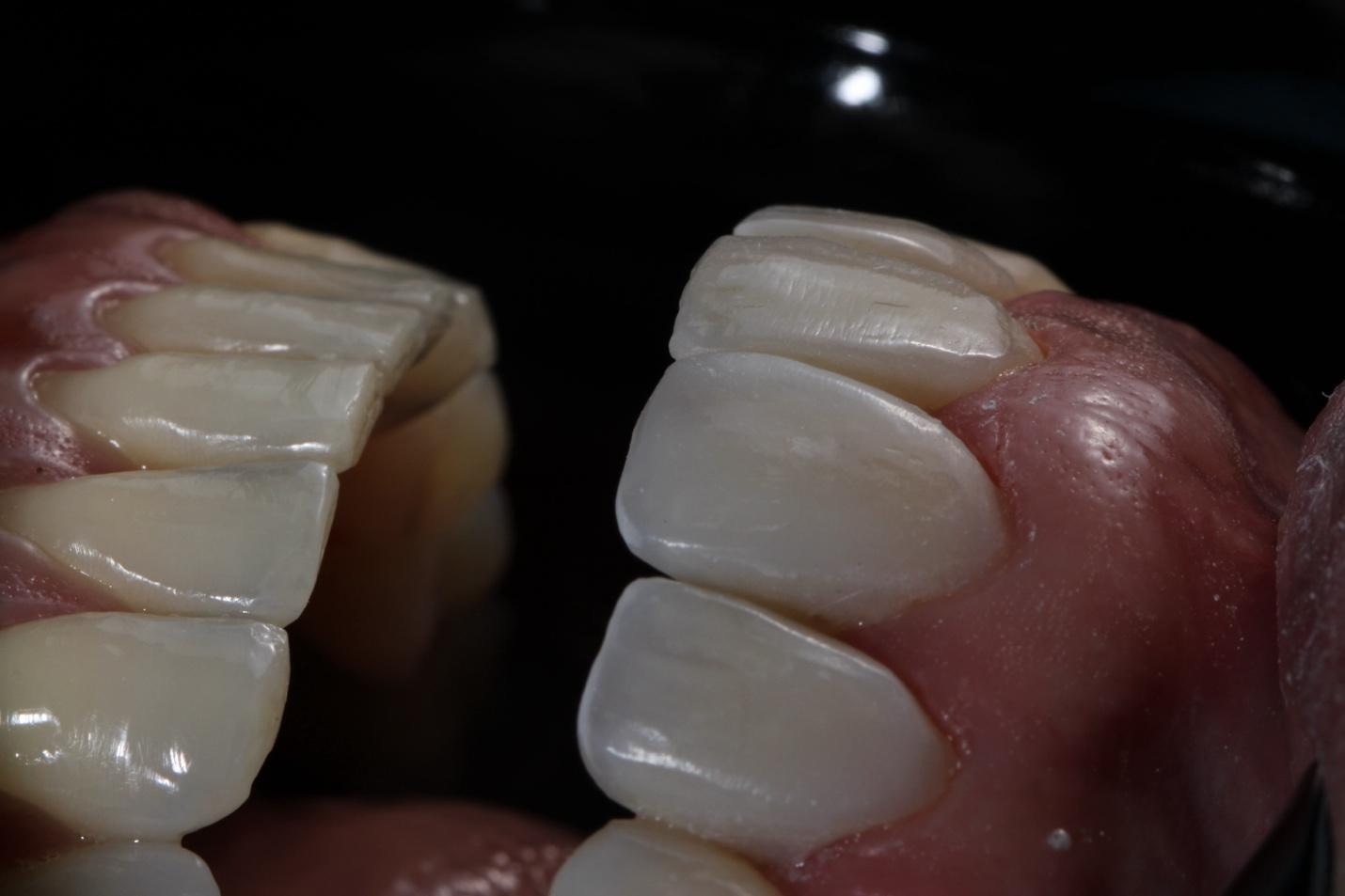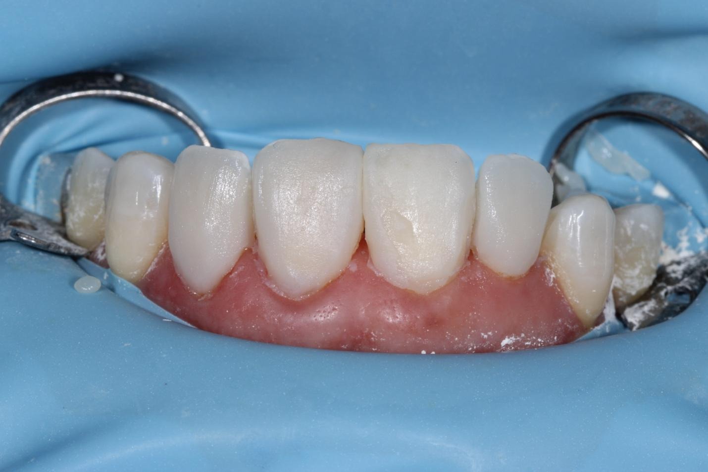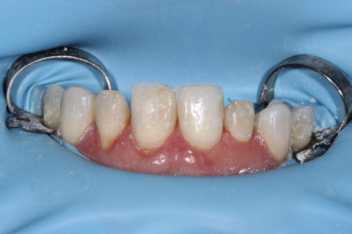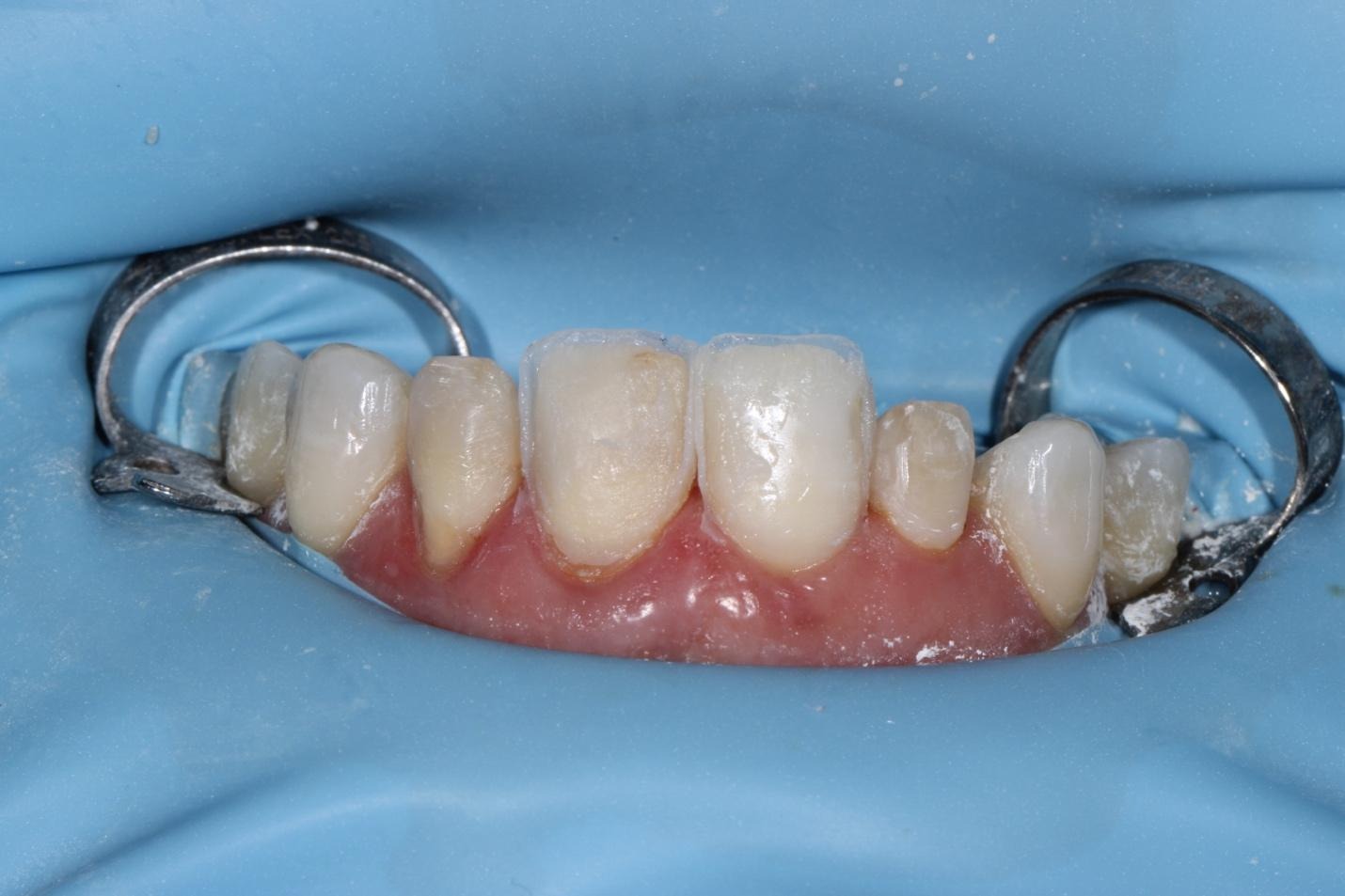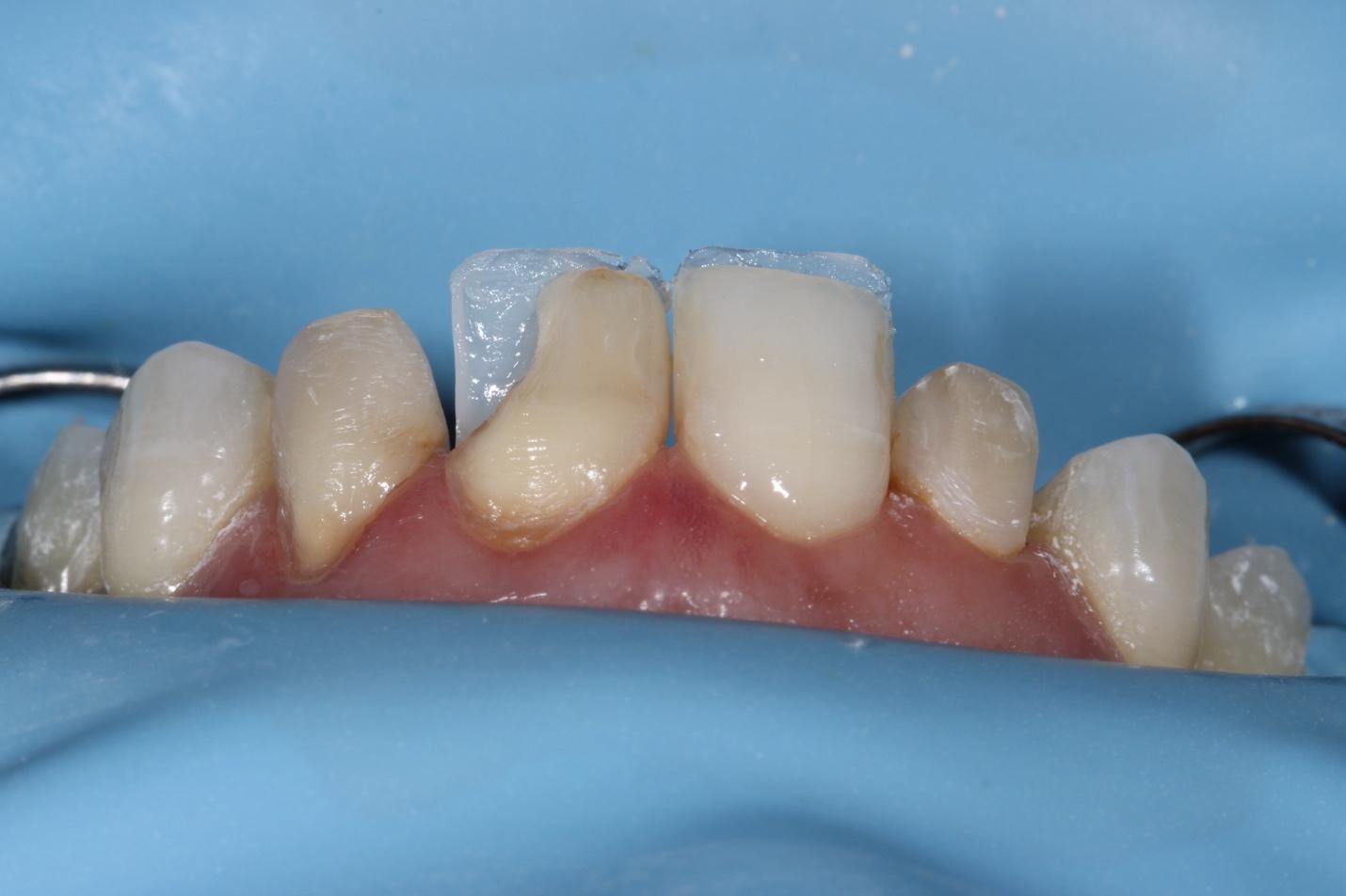 Figura 6: Construção das paredes proximais com resina Aura Enamel, cor E2, para recriar os limites mesial e distal dos incisivos centrais.