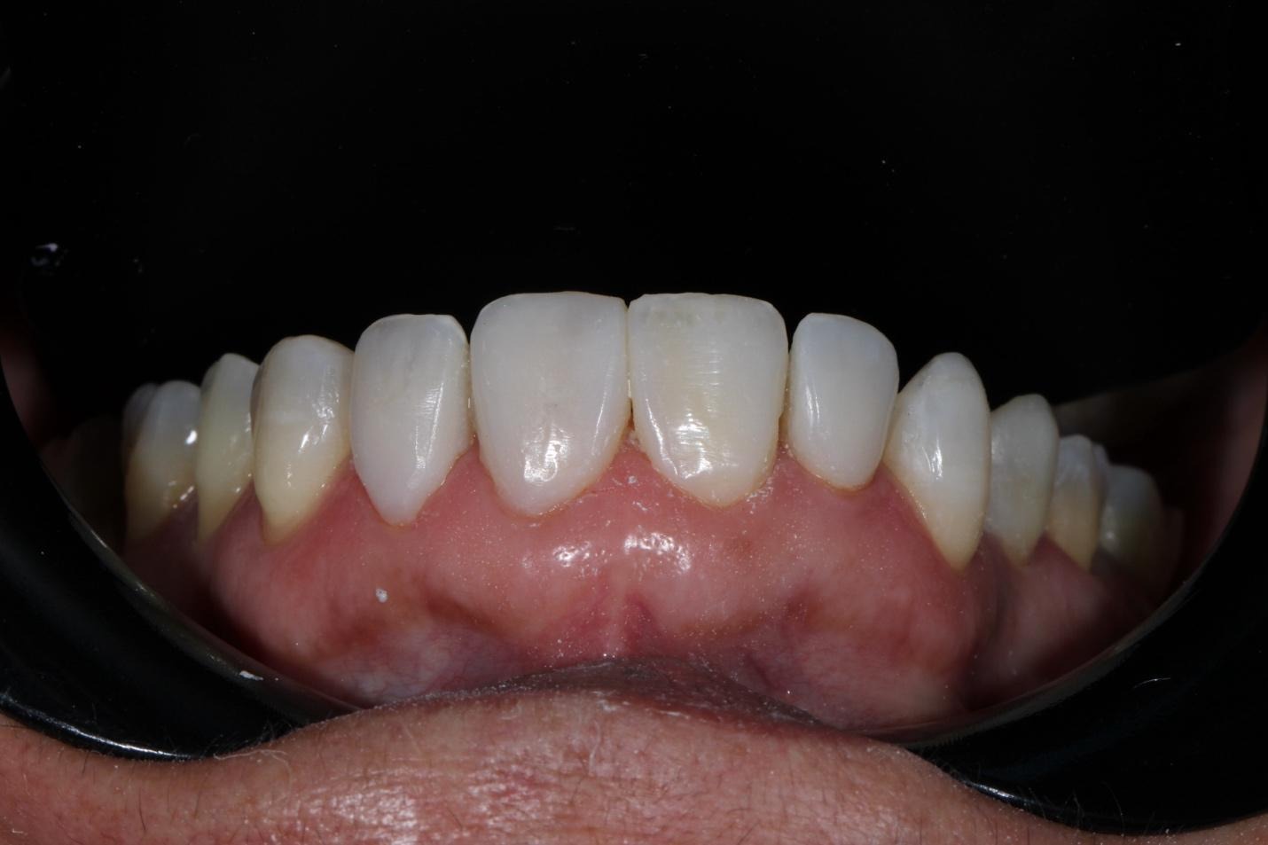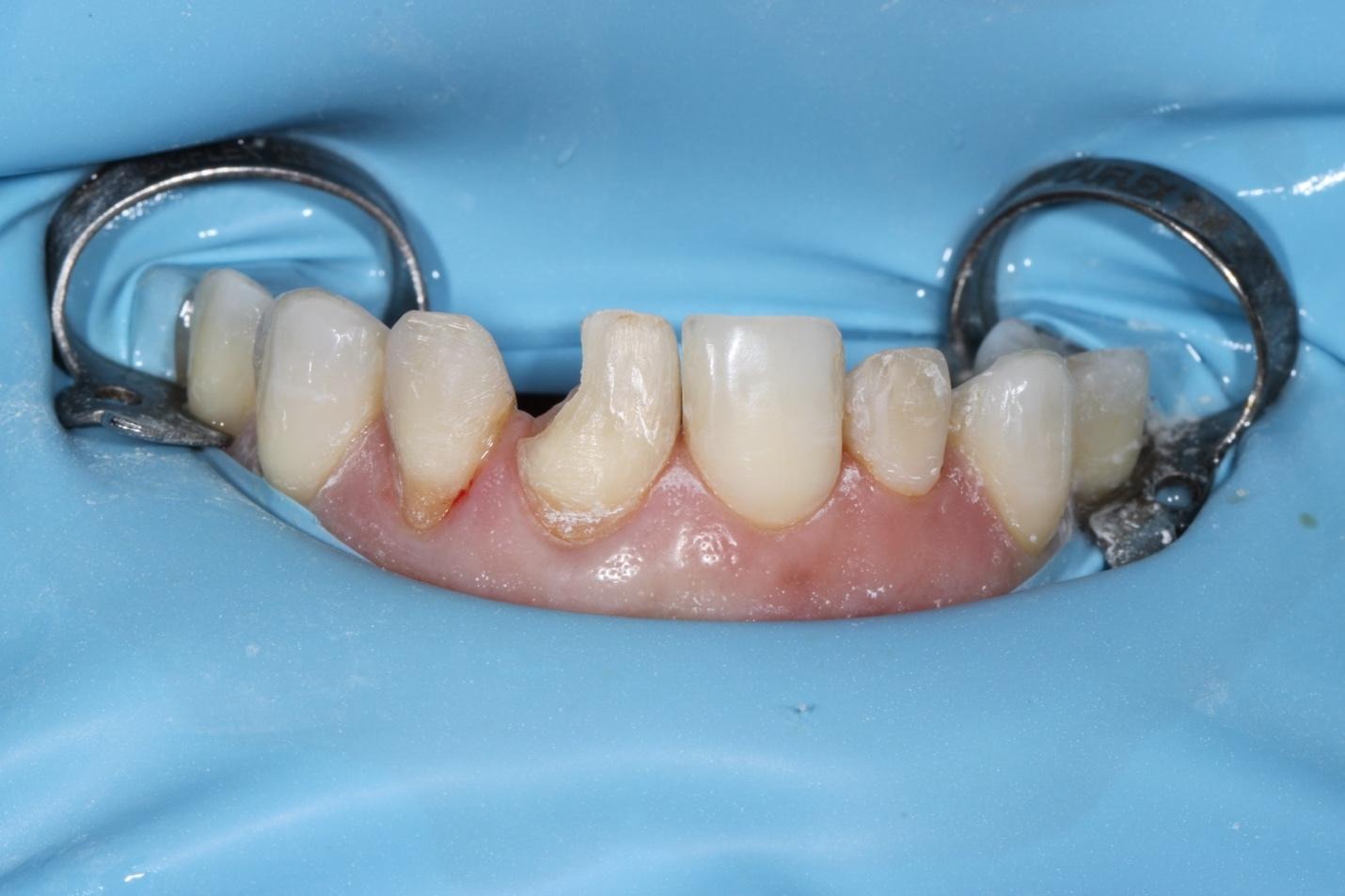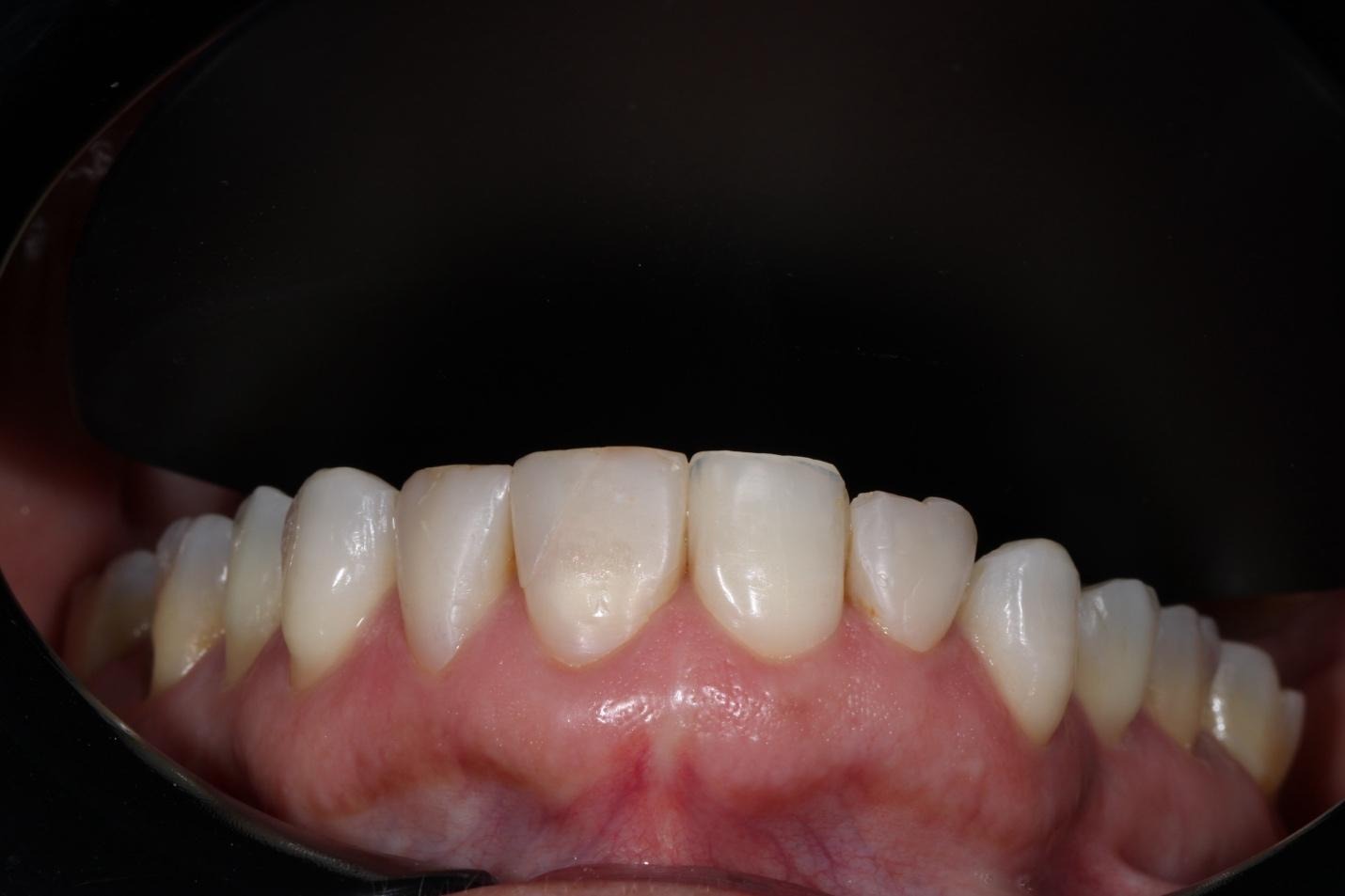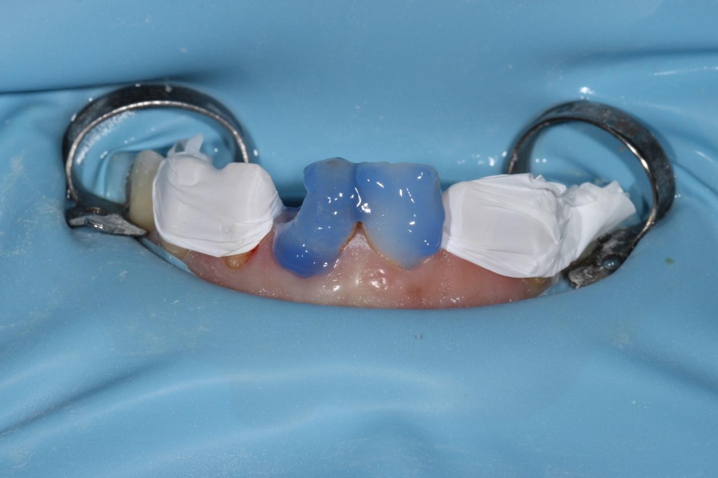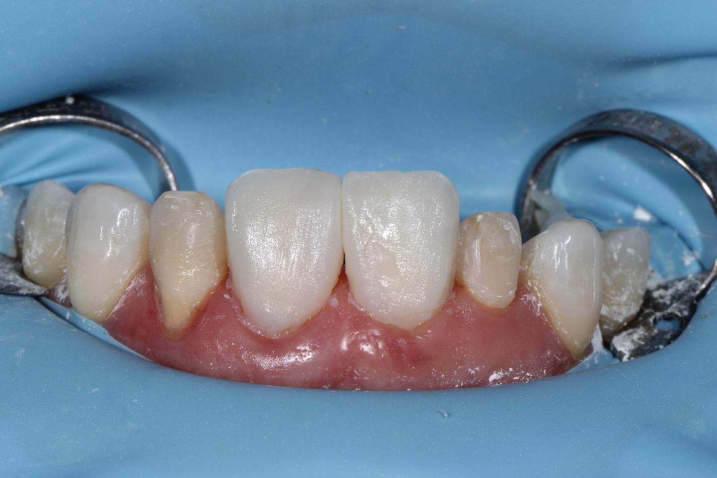 Figura 6: Construção das paredes proximais com resina Aura Enamel, cor E2, para recriar os limites mesial e distal dos incisivos centrais.