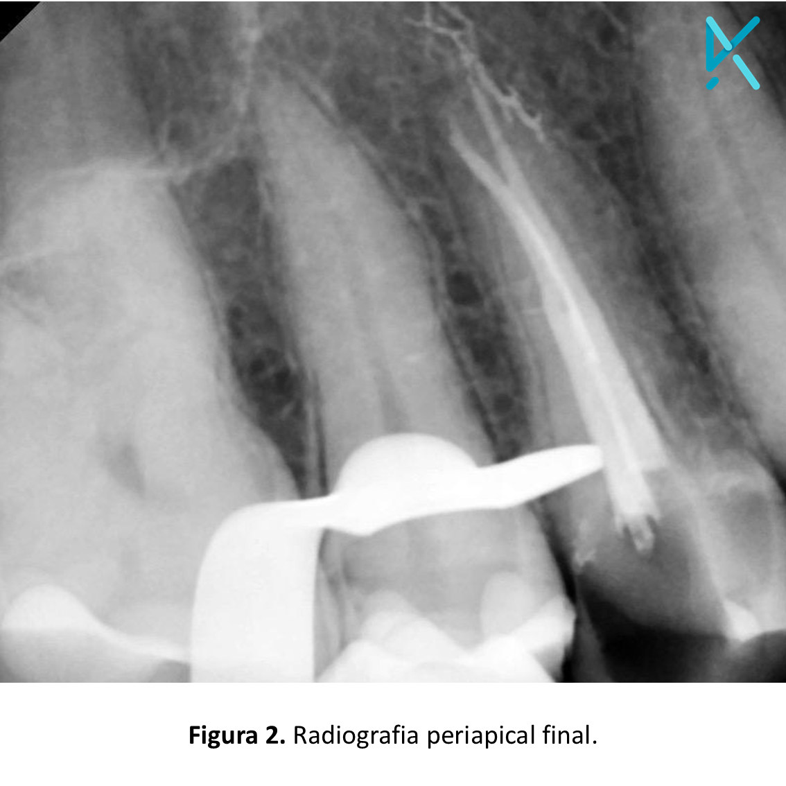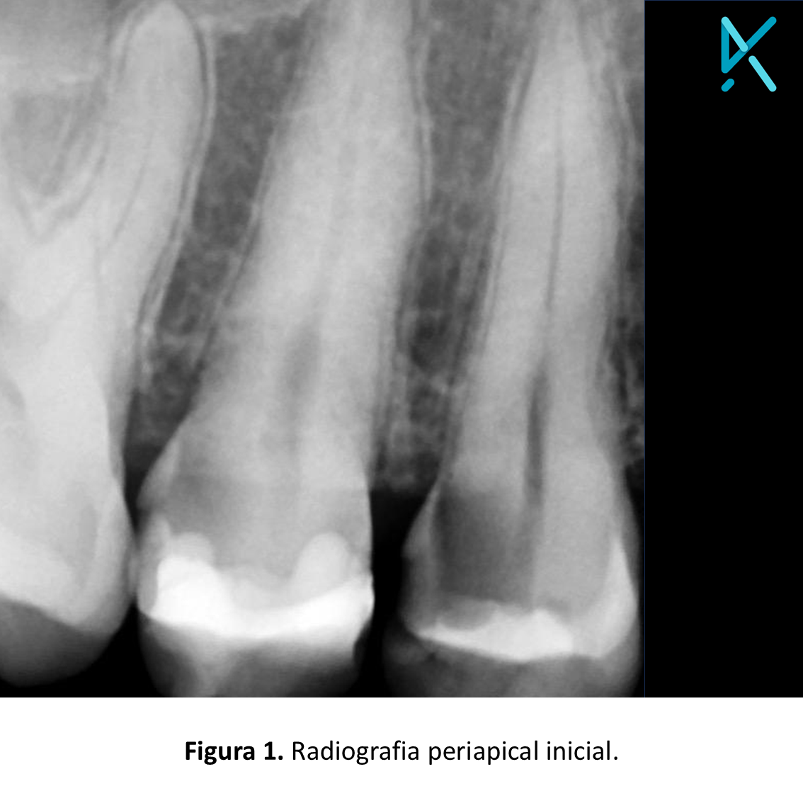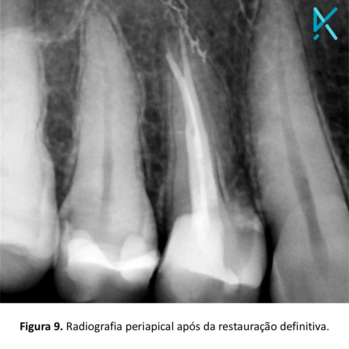 Na radiografia periapical inicial, foi possível observar uma cárie extensa envolvendo as faces distal e oclusal. A endodontia foi realizada em sessão única, e a blindagem da cavidade de acesso, juntamente com a restauração total do elemento, foi realizada com a resina Stela, da SDI, uma vez que a técnica é rápida e de fácil execução.