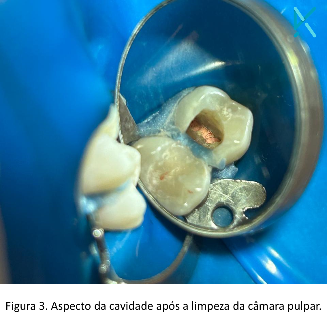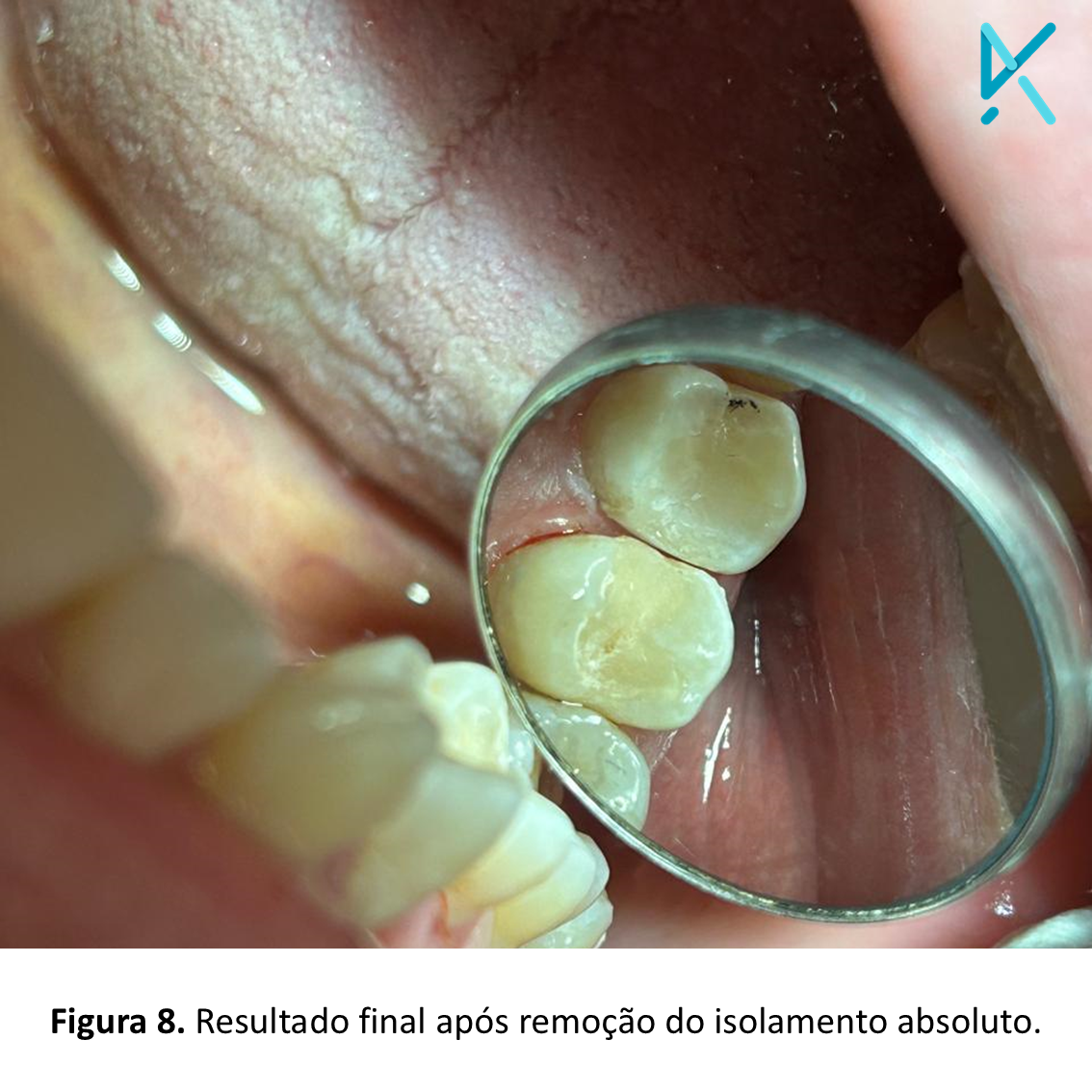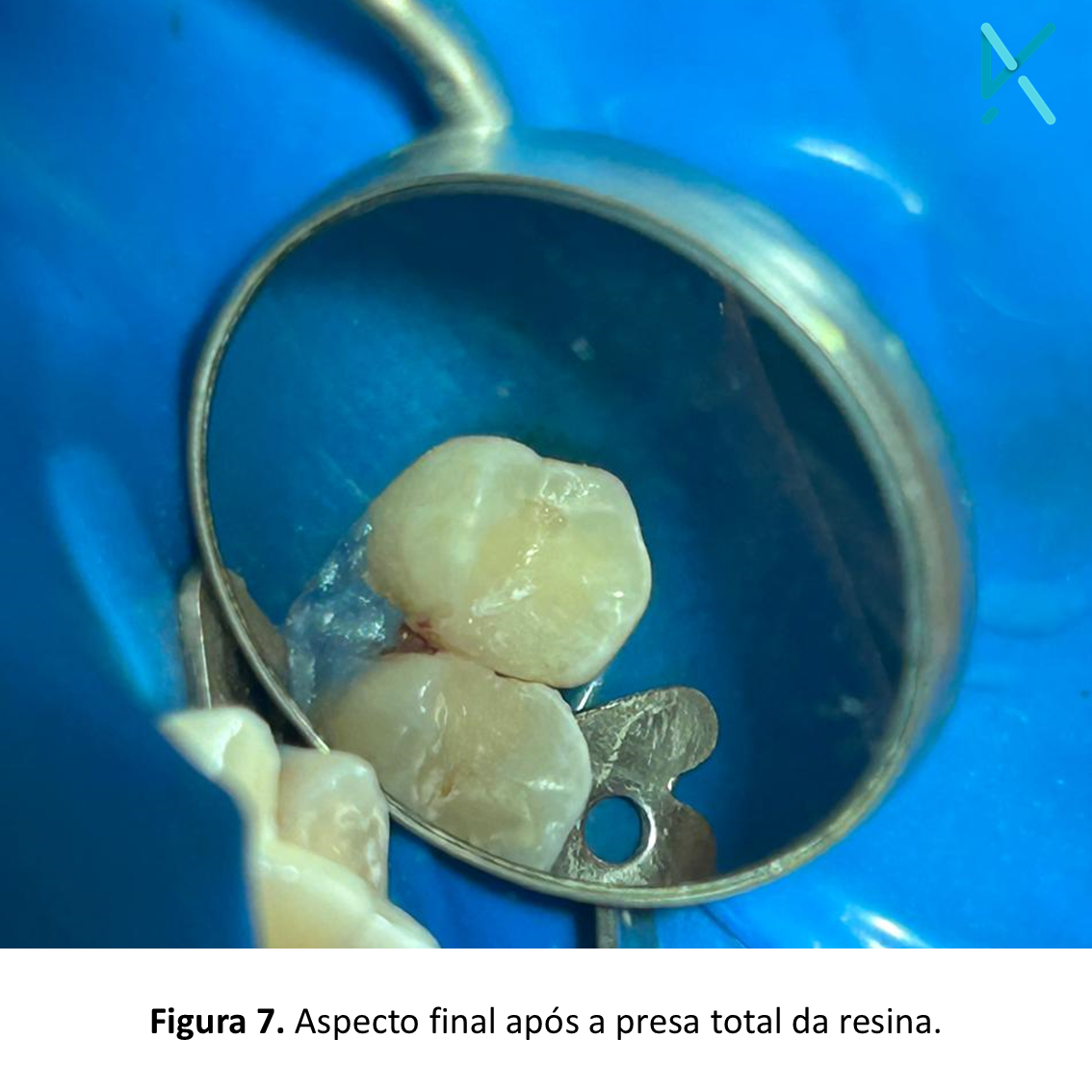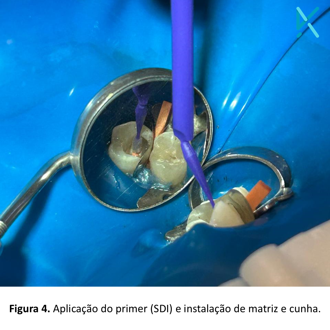 Posteriormente à limpeza da câmara pulpar e das paredes a serem restauradas, o isolamento absoluto foi ajustado, e um conjunto de matriz e cunha foi instalado na face distal do elemento. Em seguida, o primer foi aplicado em toda a cavidade e, após 5 segundos, um jato de ar foi aplicado durante 3 segundos.