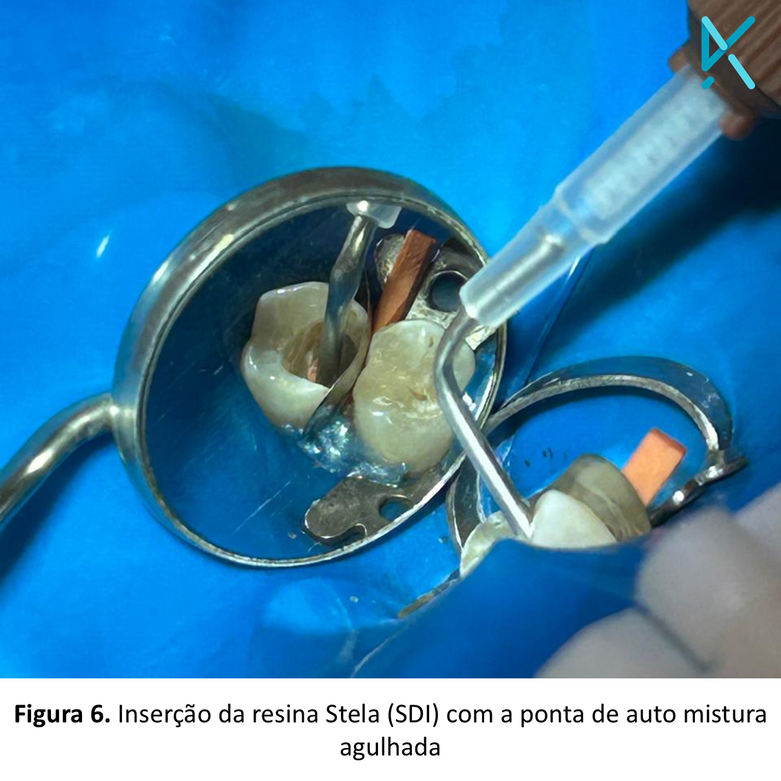 Estando a cavidade pronta para receber a blindagem endodôntica e o material restaurador definitivo, a resina Stela foi inserida com sua ponta agulhada de auto-mistura, desde a guta-percha até preencher toda a extensão da cavidade, com uma técnica de retroinjeção em uma única aplicação.