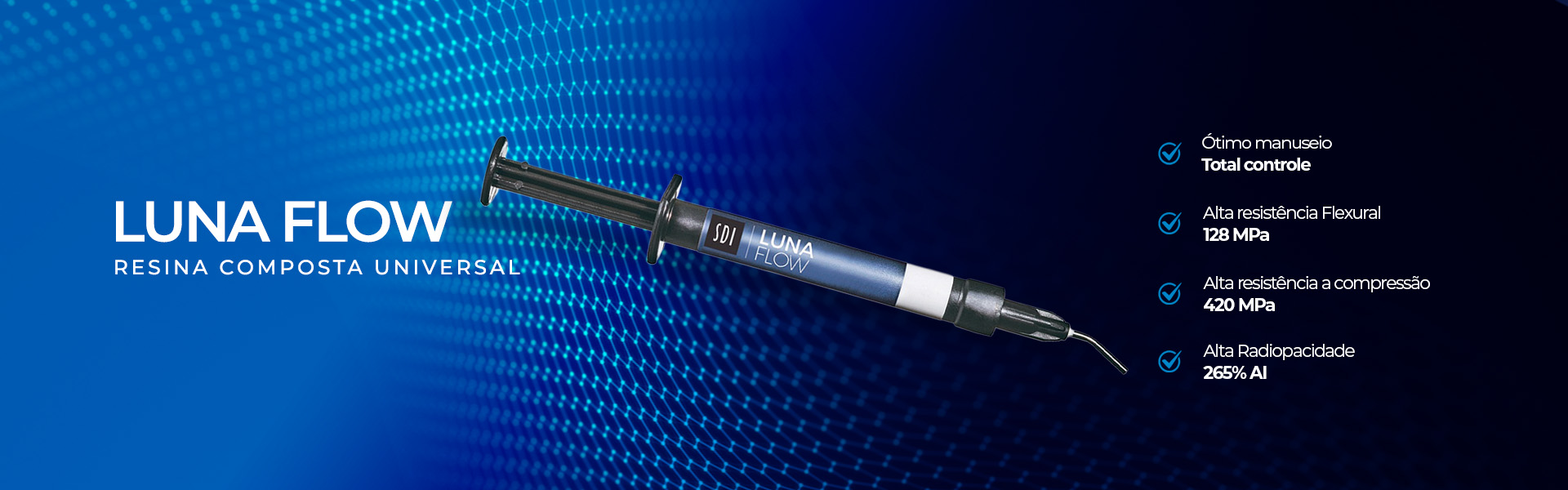 A Luna Flow é uma nova resina composta fluida, disponível em duas viscosidades. Com uma mistura de partículas de diferentes tamanhos ultrafinos para otimizar o manuseio, as propriedades mecânicas e ópticas da Luna Flow oferecem elevada radiopacidade, controle sobre a aplicação, facilidade na escolha de cor com estabilidade, excelente força e resistência contra o desgaste. Estas propriedades fazem da Luna Flow uma opção universal fantástica de forramento; base; restauração provisória ou de reparo; e Classe V; entre outras indicações.
