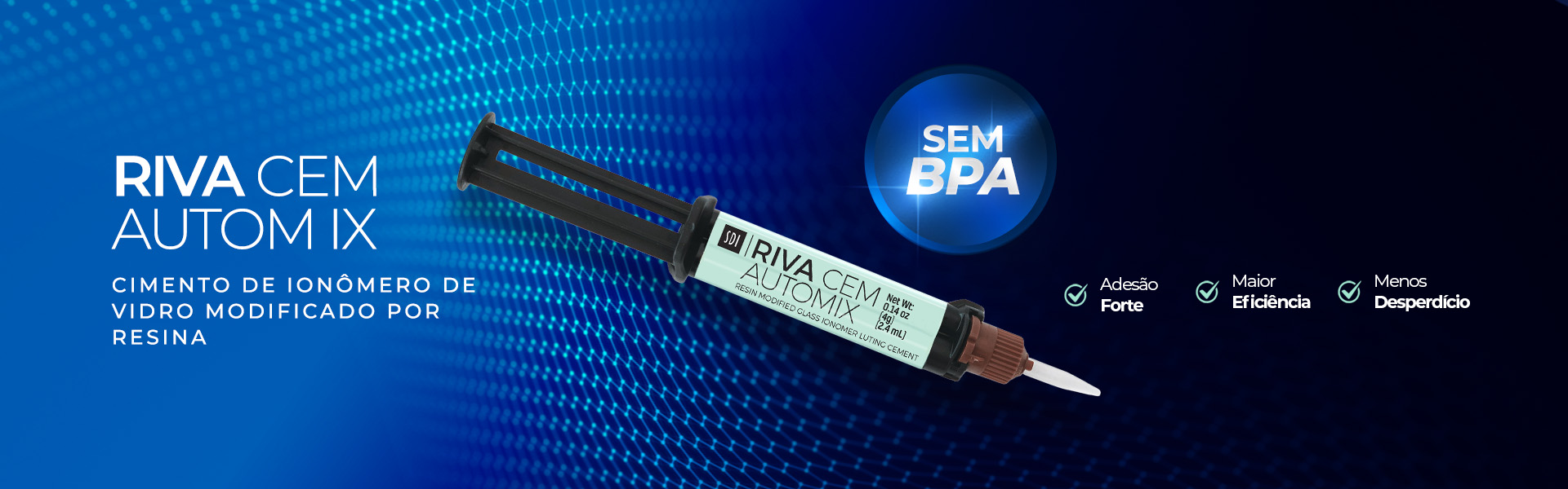 O Riva Cem Automix é um cimento de ionômero de vidro modificado por resina em seringa de automistura, com liberação de flúor, autopolimerizável e radiopaco. É indicado para a cimentação permanente de restaurações metálicas e cerâmicas. O acessório de ponta automix oferece conveniência em relação aos sistemas tradicionais de cimentos com mistura manual.
