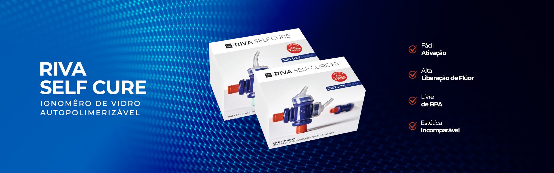 A nova geração de ionômero de vidro, este sistema de alto desempenho combina um material restaurador híbrido a base de vidro com um revestimento de resina para maximizar a longevidade e a resistência das restaurações do seu paciente. O Riva Self Cure ganhou sua reputação devido sua liberação de flúor superior, alta resistência e excelente manuseio.